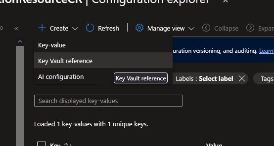 The next stage is to add this secret now into the AppConfiguration as a Key/Value pair. This time we add as a KeyVault reference rather than a key/value pair.