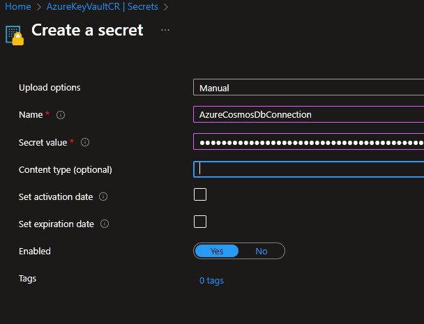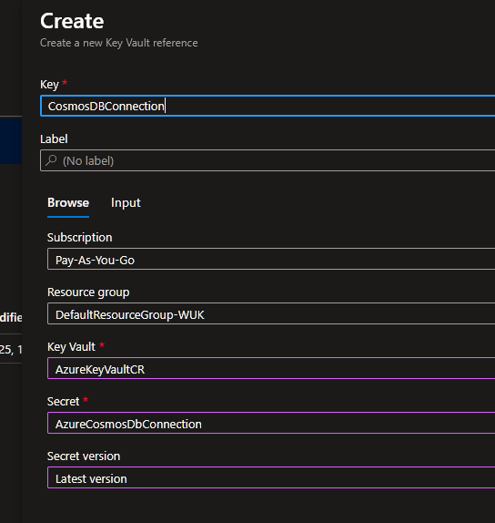 Next is to add a secret into the keyvault. For this i’m going to create a CosmosDb resource, and store it’s connection string in there. then we’re going to access this in code.